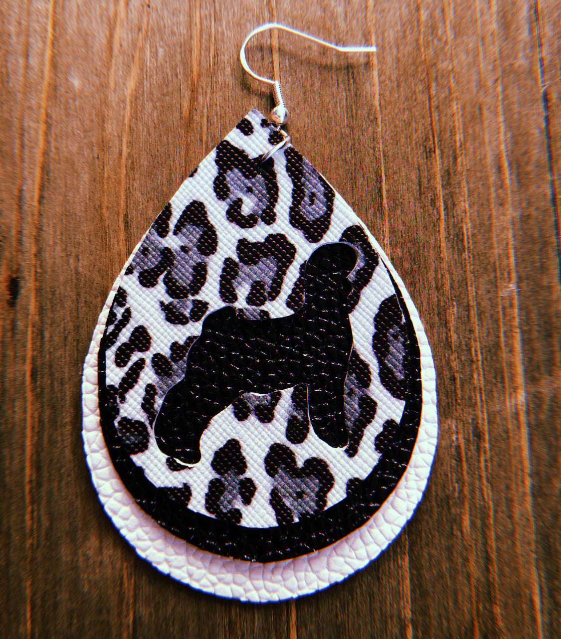 super simple and cute black, grey, & white cheetah print goat teardrop shaped earrings a white middle layer, and a black bottom layer. these are super lightweight and a perfect match for just about any outfit!