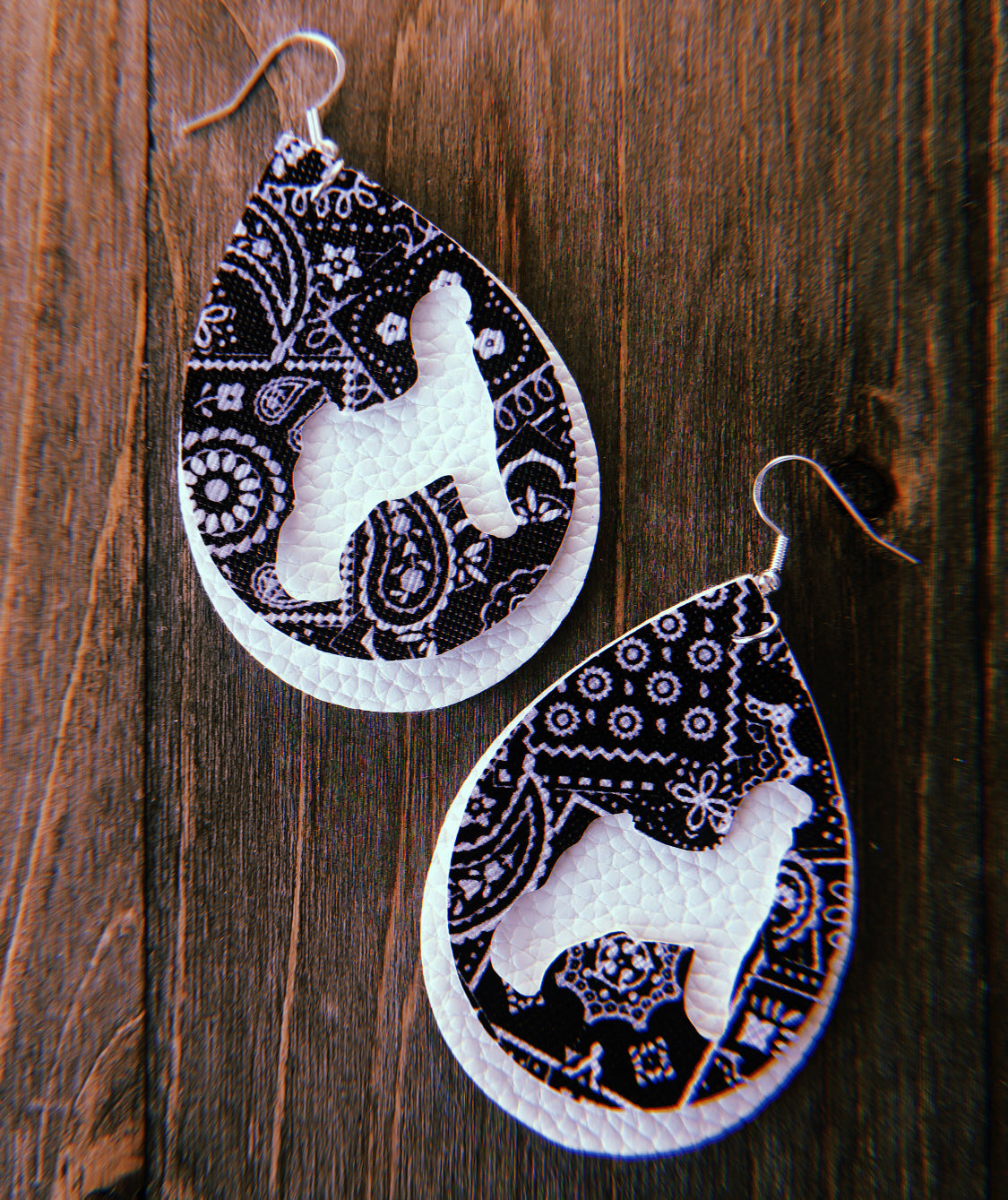 double layer black paisley goat teardrop shaped earrings with a white bottom layer. these are super lightweight and give an adorable touch to any outfit!