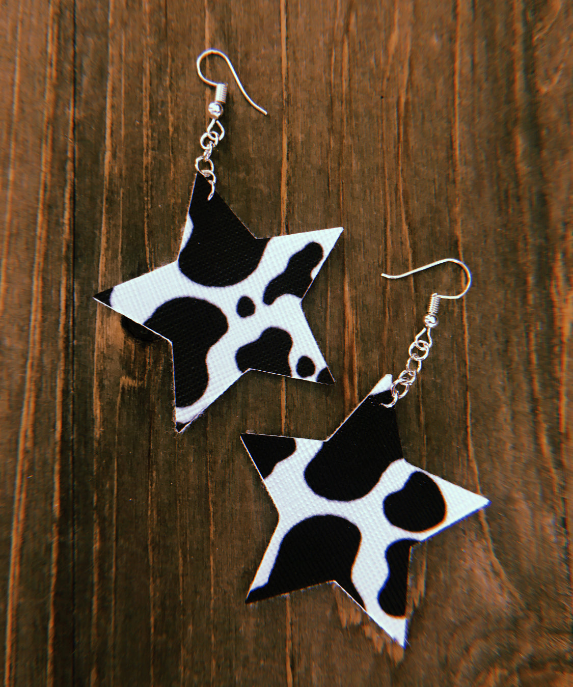 black and white cow print star shaped dangle earrings. these are super lightweight and are the perfect added touch to any outfit!