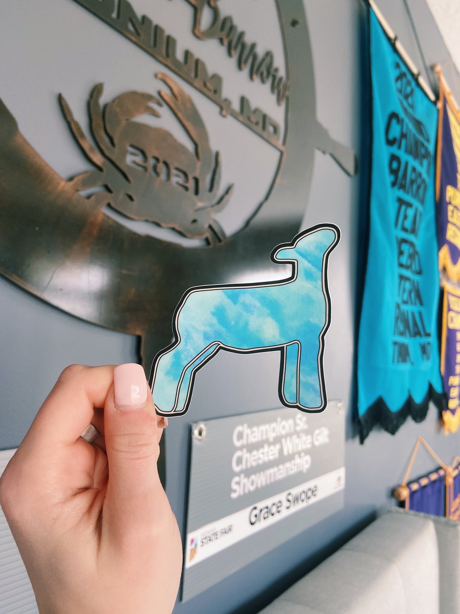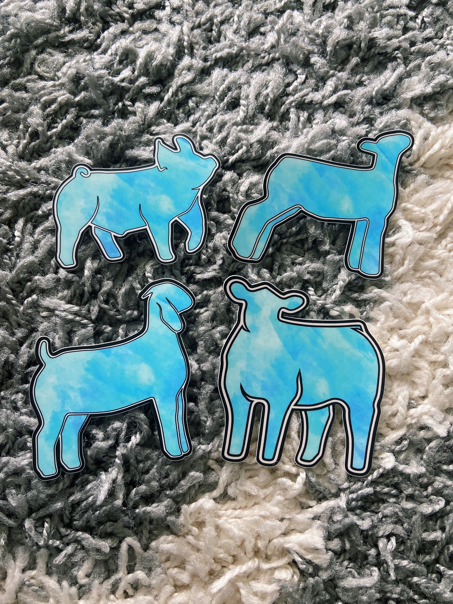 super cute 2 to 3 inch by 3 inch blue tie dye pig, cow, lamb, & goat stickers. these are super durable, long lasting, waterproof stickers that can be placed on just about anything including your tack box, laptop, phone case, etc!