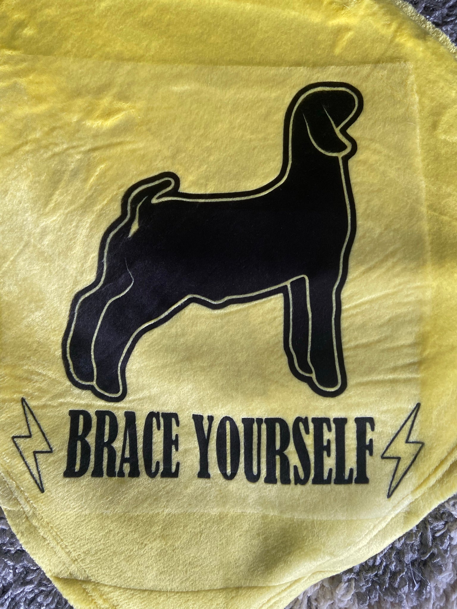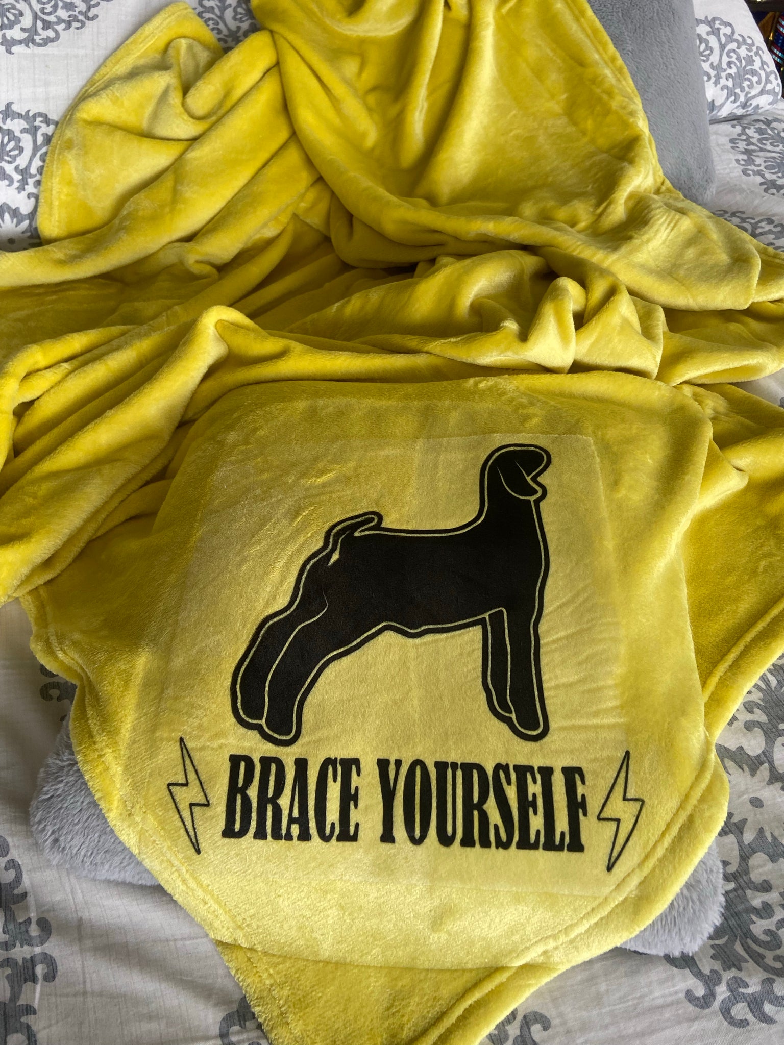 super cute mustard yellow 60x80 blanket with “brace yourself” & a show goat and lightning bolts in black! these are super soft and durable! this is the perfect blanket for all my goat lovers!