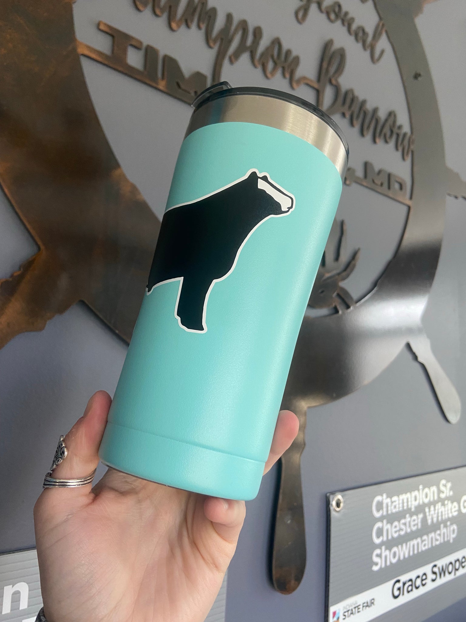 super cute 20 ounce blue/turquoise tumbler with a black and white crossbred steer decal. these tumblers keep drinks hot and cold all day long. this is the perfect tumbler for all my cattle lovers!