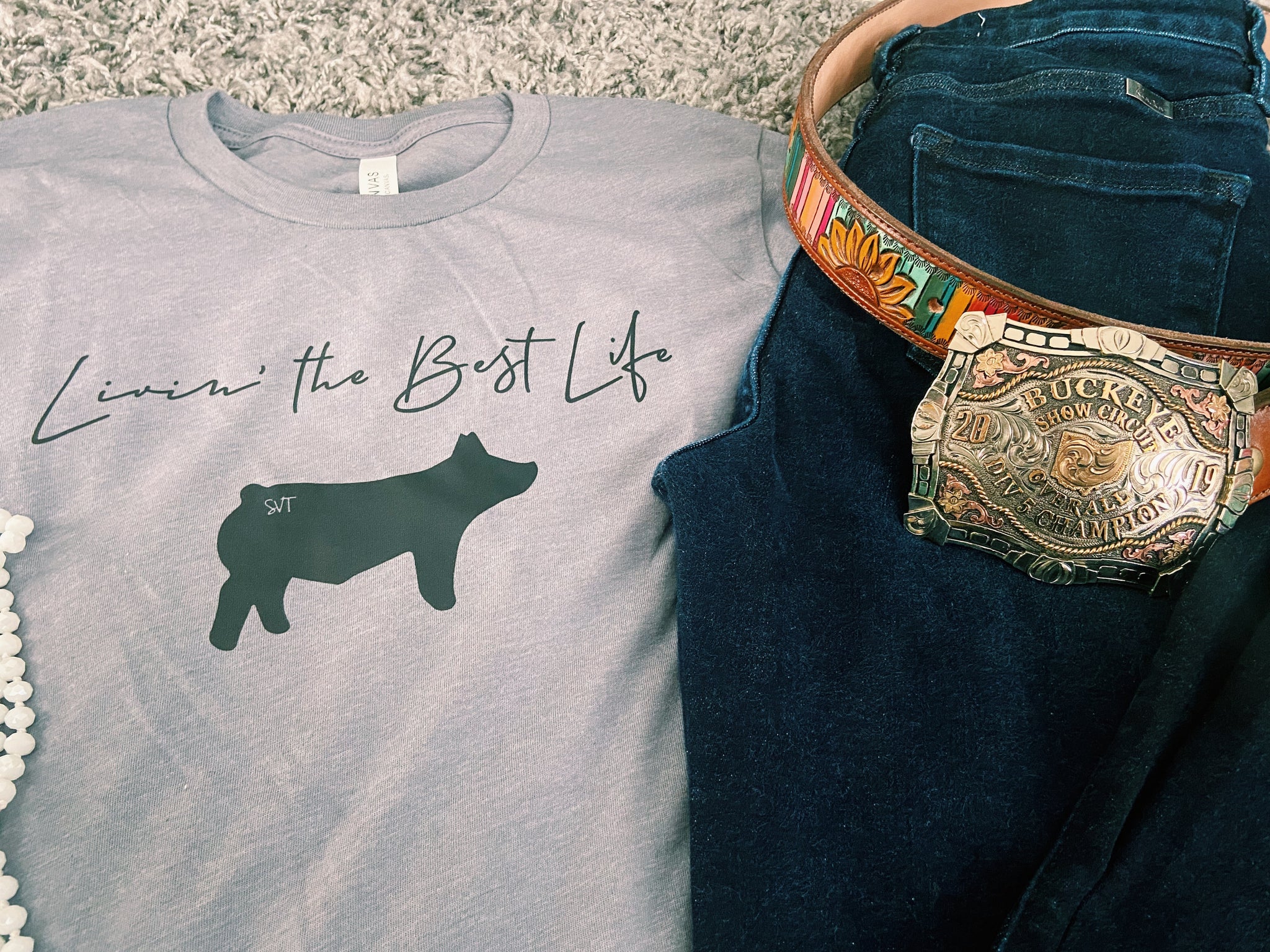super comfy livin’ the best life grey pig t-shirt! this would like super cute worn just as a t-shirt or you could add a shacket overtop of it!