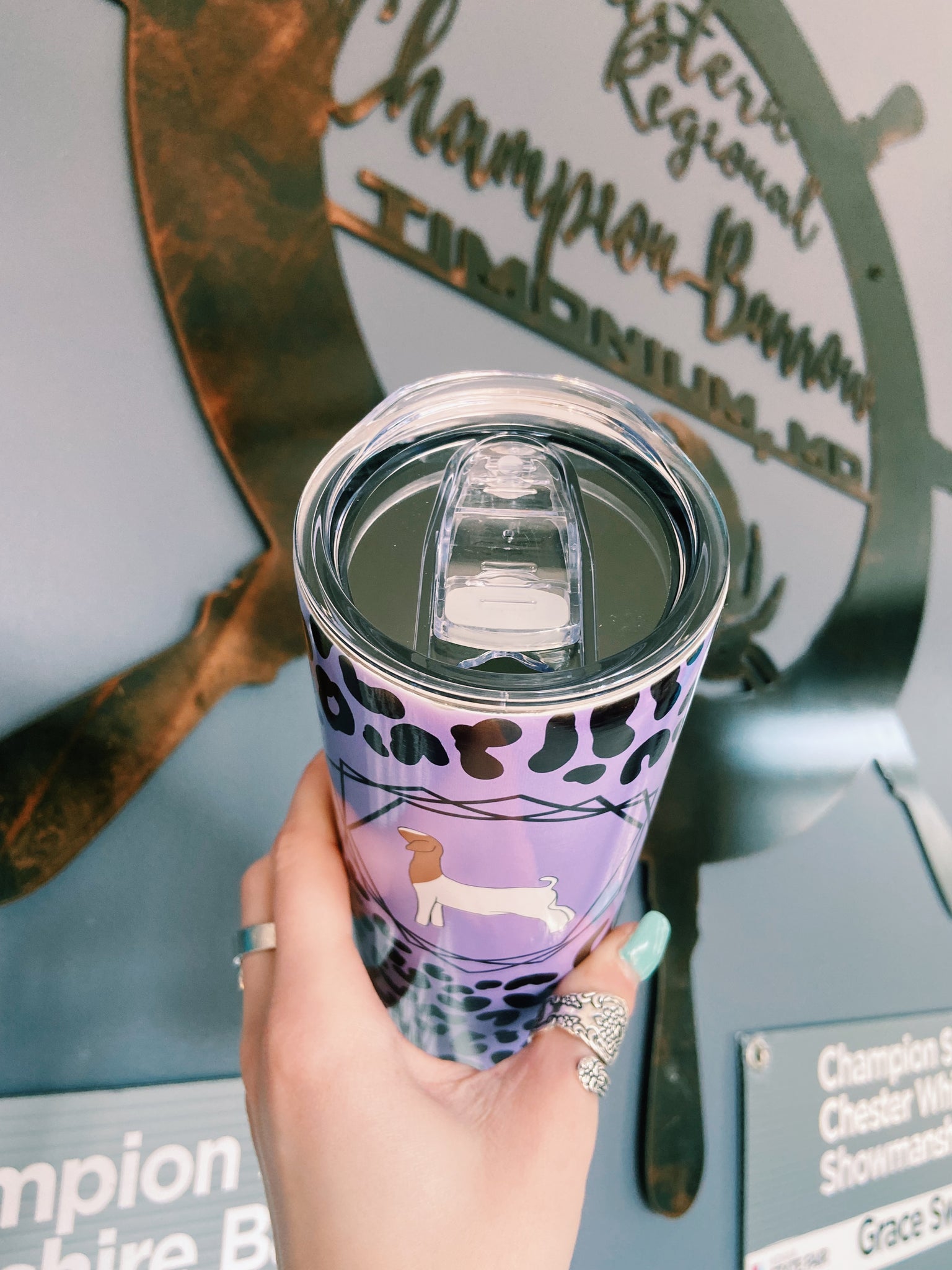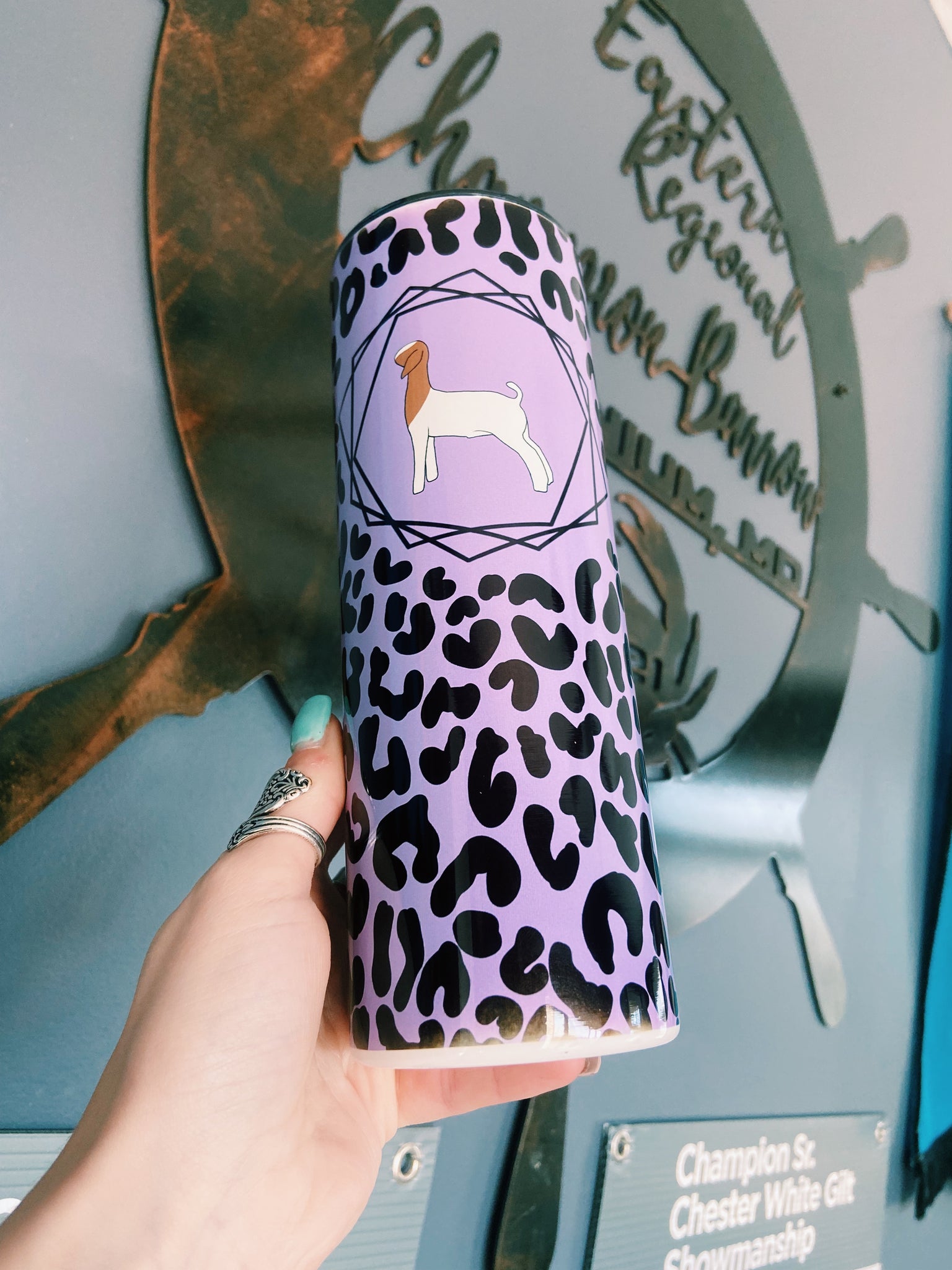 super cool 20 ounce purple cheetah print goat skinny tumbler. these are perfect for keeping drinks hot & cold all day and come with a reusable straw!