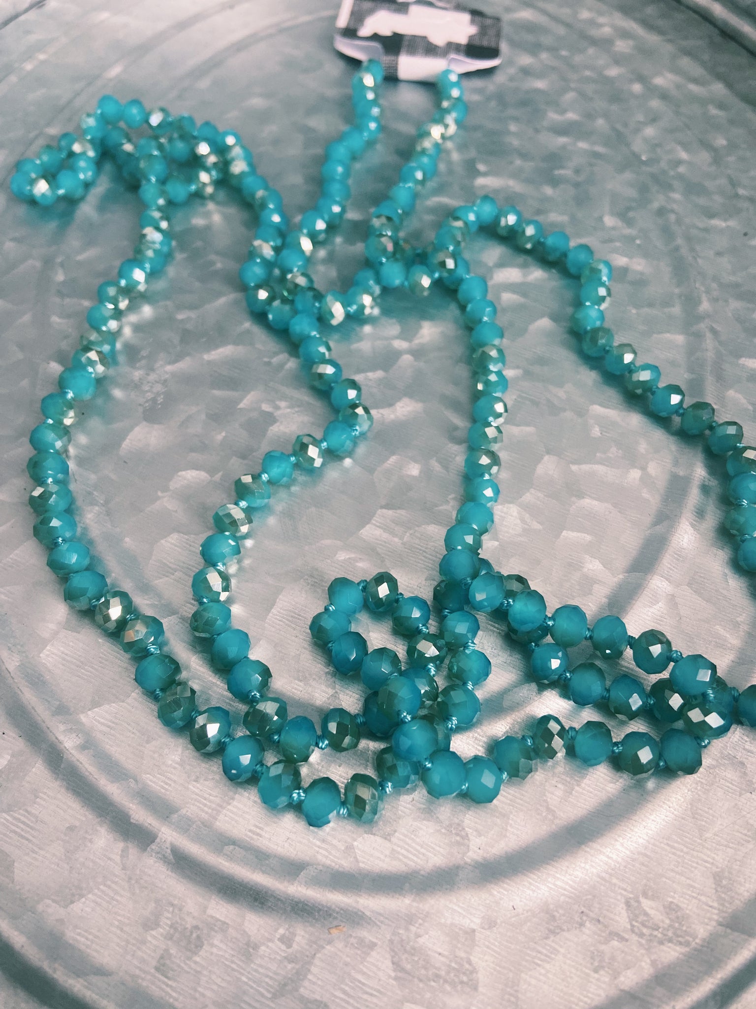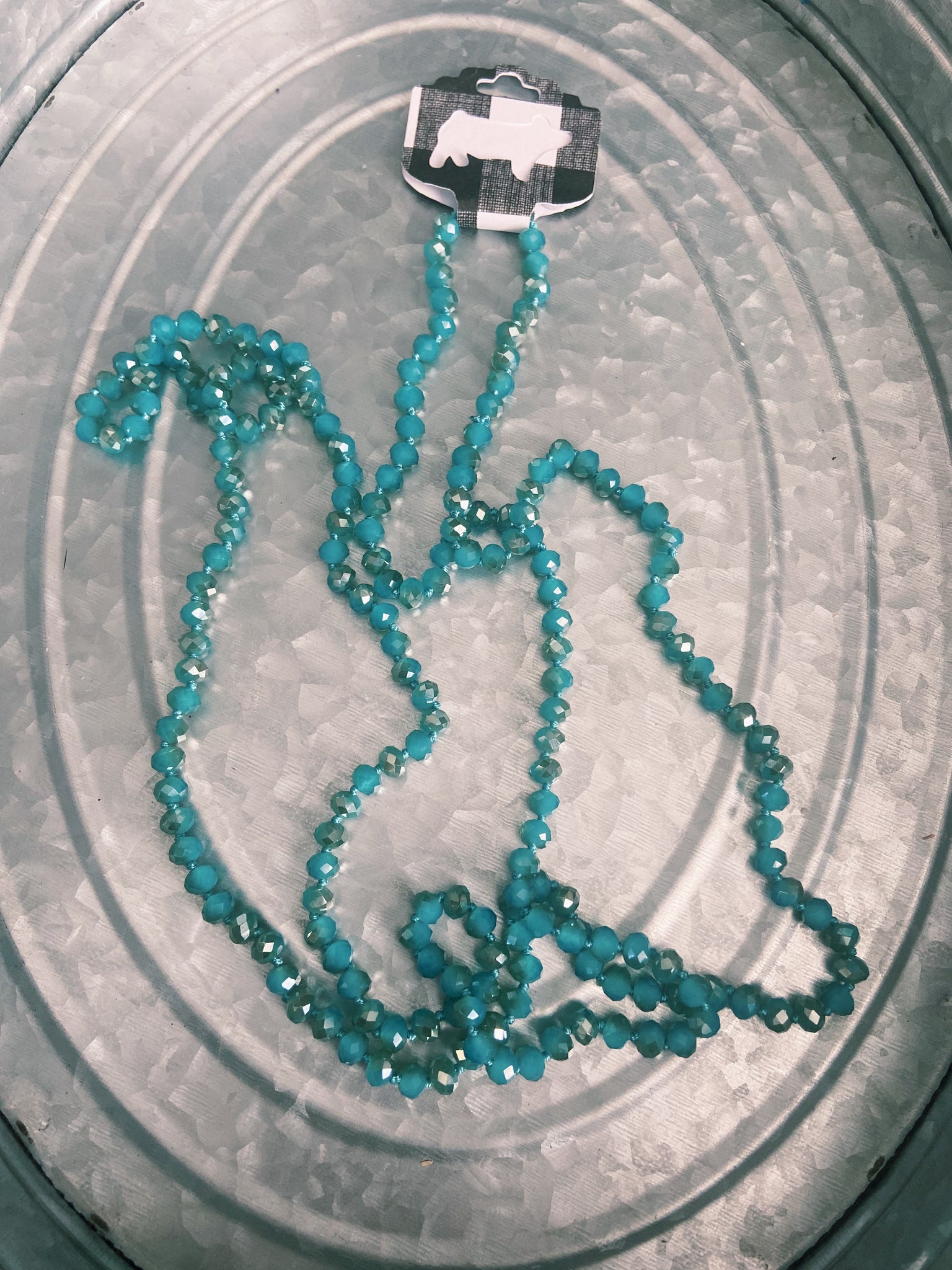 super pretty 60 inch long teal and gold glossy finish beaded necklace. this is a super pretty color that will match perfectly with any outfit you'd like!