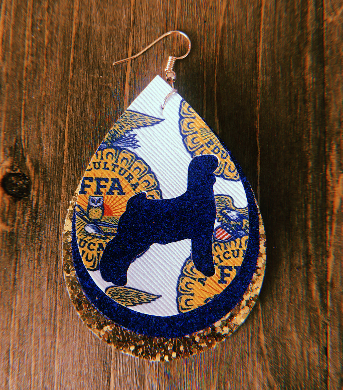super popular triple layer FFA goat teardrop shaped earrings with a sparkly blue middle layer and sparkly gold bottom layer. these earrings are lightweight and go perfectly with any FFA attire as well as everyday wear!